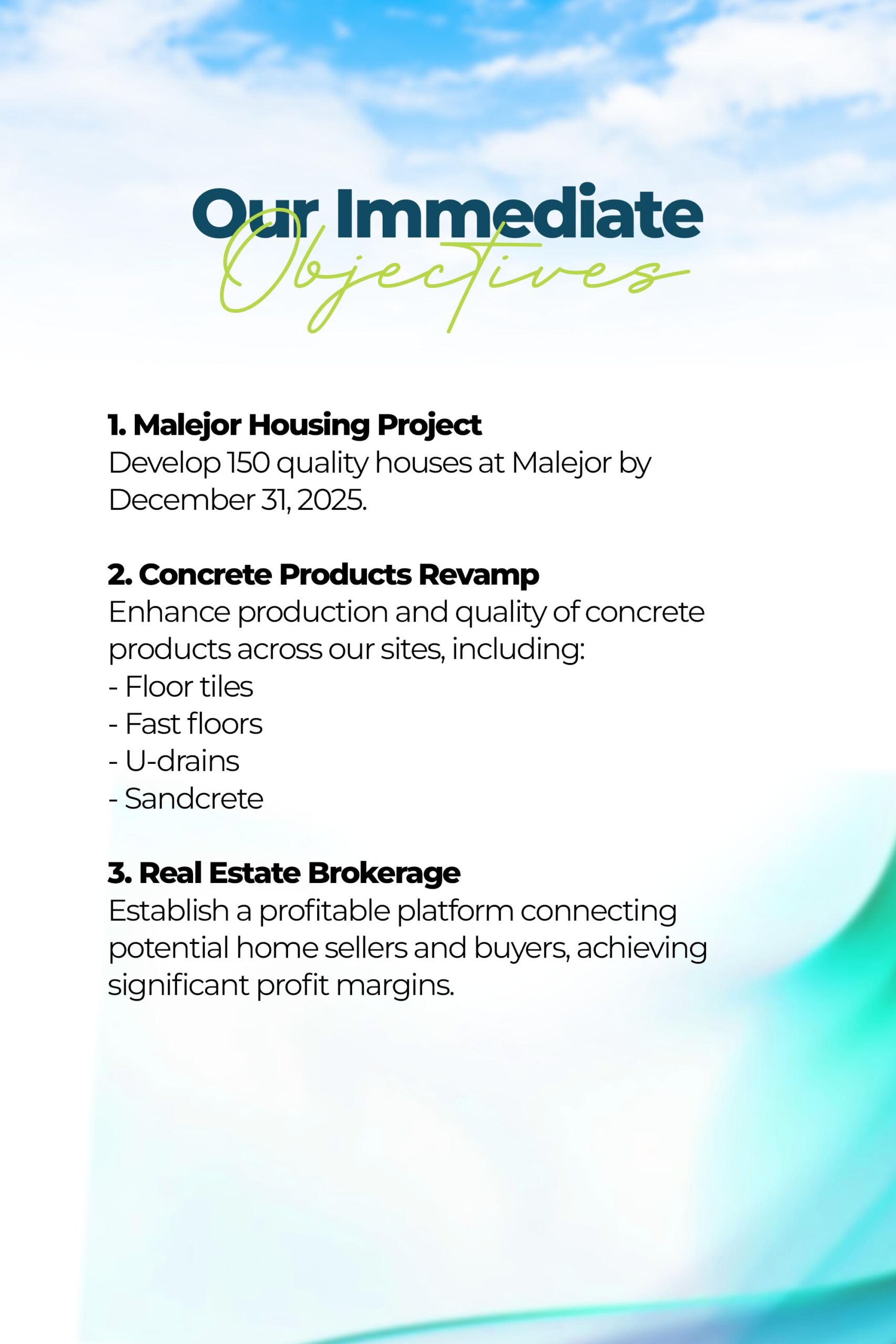 We specialize in the development of high-quality, affordable residential and commercial properties. Our real estate division is dedicated to creating modern, sustainable, and comfortable living and working spaces for individuals, families, and businesses across Ghana.
